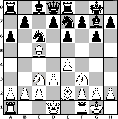 game notation in PGN-format [Event "Gl"] [Site "www.myChess.de"] [Date "2012.06.07"] [Round "1"] [White "paul"] [Black "beowulf"] [ECO "B30"] [WhitemyELO "1303"] [BlackmyELO "1424"] [Result "0-1"] [TimeControl "10/2592000"] [WhiteDays "00"] [BlackDays "24"] [MyChessNo "82031"] 1. e4 c5 2. Nf3 Nc6 3. Nc3 g6 4. Bb5 Bg7 5. O-O a6 6. Be2 e6 7. d3 Nge7 8. Be3 O-O 9. Bxc5 Re8 0-1 position notation in FEN-format r1bqr1k1/1p1pnpbp/p1n1p1p1/2B5/4P3/2NP1N2/PPP1BPPP/R2Q1RK1 - - - 1 10 Captured white pieces: ![]() ![]() ![]() ![]() ![]() ![]() ![]() ![]() ![]() ![]() ![]() ![]() ![]() ![]() ![]() Captured black pieces: ![]() ![]() ![]() ![]() ![]() ![]() ![]() ![]() ![]() ![]() ![]() ![]() ![]() ![]() ![]() Click on a captured piece in order to display the desired move!