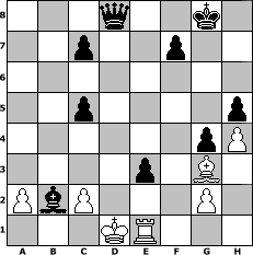 game notation in PGN-format [Event "Zug um Zug gegen Fr"] [Site "www.myChess.de"] [Date "2012.03.12"] [Round "1"] [White "Knight"] [Black "Aliasalias"] [ECO "D00"] [WhitemyELO "1271"] [BlackmyELO "1574"] [Result "0-1"] [TimeControl "10/2592000"] [WhiteDays "120"] [BlackDays "104"] [MyChessNo "80558"] 1. d4 d5 2. e4 dxe4 3. Nc3 Nf6 4. f3 exf3 5. Qxf3 Qxd4 6. Be3 Qg4 7. Qf2 a6 8. Be2 Qb4 9. O-O-O e5 10. Nf3 Nc6 11. Bd2 Qe7 12. Bg5 h6 13. Bh4 g5 14. Bg3 e4 15. Nd4 e3 16. Qf3 Bg4 17. Qf1 h5 18. Bxg4 Nxg4 19. Nxc6 bxc6 20. Qe2 Bg7 21. h3 Nf6 22. Qc4 c5 23. Rhe1 g4 24. h4 O-O 25. Nd5 Nxd5 26. Rxd5 Rab8 27. Qxa6 Bxb2+ 28. Kd1 Rbd8 29. Rd3 Rxd3+ 30. Qxd3 Rd8 31. Qxd8+ Qxd8+ 0-1 position notation in FEN-format 3q2k1/2p2p2/8/2p4p/6pP/4p1B1/PbP3P1/3KR3 - - - 0 32 Captured white pieces: Captured black pieces: Click on a captured piece in order to display the desired move!