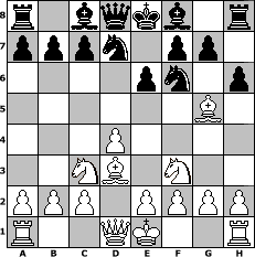 game notation in PGN-format [Event "1. Weltmeisterschaft @ myschach.de"] [Site "www.myChess.de"] [Date "2006.09.15"] [Round "2"] [White "MartinSilies"] [Black "bane"] [ECO "B01"] [WhitemyELO "1547"] [BlackmyELO "1933"] [Result "0-1"] [TimeControl "10/2592000"] [WhiteDays "00"] [BlackDays "28"] [MyChessNo "28496"] 1. e4 d5 2. exd5 Qxd5 3. Nc3 Qd8 4. Nf3 Nf6 5. d4 e6 6. Bg5 Nbd7 7. Bd3 h6 0-1 position notation in FEN-format r1bqkb1r/pppn1pp1/4pn1p/6B1/3P4/2NB1N2/PPP1PPPP/R2QK2R - KQkq - 0 8 Captured white pieces: Captured black pieces: Click on a captured piece in order to display the desired move!