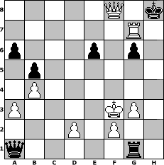 game notation in PGN-format [Event "Mailüfterl"] [Site "www.myChess.de"] [Date "2018.04.23"] [Round "1"] [White "Steffi"] [Black "Joschi"] [ECO "A56"] [WhitemyELO "1562"] [BlackmyELO "1503"] [Result "1-0"] [TimeControl "10/1728000"] [WhiteDays "52"] [BlackDays "80"] [MyChessNo "112060"] 1. d4 Nf6 2. c4 c5 3. e3 g6 4. Nf3 Bg7 5. Nc3 O-O 6. g3 cxd4 7. exd4 d5 8. cxd5 Nxd5 9. Bg2 e6 10. O-O Nc6 11. Re1 a6 12. h4 b5 13. a3 Bb7 14. Nxd5 Qxd5 15. Be3 Rfd8 16. Ne5 Qd6 17. Nxc6 Bxc6 18. Bxc6 Qxc6 19. Rc1 Qd5 20. b4 Bxd4 21. Bxd4 Qxd4 22. Qf3 Qd3 23. Re3 Qd5 24. Qf6 Qd4 25. Re5 Rd5 26. Rc7 Rd7 27. Rcc5 Rad8 28. h5 Qa1+ 29. Kg2 Rd1 30. hxg6 hxg6 31. Rc7 Rg1+ 32. Kf3 Rf8 33. Rxe6 fxe6 34. Rg7+ Kh8 35. Qxf8# 1-0 position notation in FEN-format 5Q1k/6R1/p3p1p1/1p6/1P6/P4KP1/3P1P2/q5r1 - - - 0 35 Captured white pieces: Captured black pieces: Click on a captured piece in order to display the desired move!