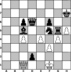 game notation in PGN-format [Event "Turnier zum Tag der deutschen Einheit 2015"] [Site "www.myChess.de"] [Date "2015.10.03"] [Round "1"] [White "MiFie"] [Black "Gauss1233"] [ECO "B01"] [WhitemyELO "1050"] [BlackmyELO "1383"] [Result "0-1"] [TimeControl "10/1728000"] [WhiteDays "041"] [BlackDays "120"] [MyChessNo "100615"] 1. e4 d5 2. Nc3 d4 3. Nd5 e6 4. Nf4 e5 5. Nd5 c6 6. Nb4 Bxb4 7. a3 Ba5 8. Bc4 b5 9. Bd3 Qg5 10. g3 Be6 11. Nf3 Qf6 12. b4 Bc7 13. O-O Bg4 14. Be2 Bxf3 15. Bxf3 Nd7 16. d3 Ne7 17. a4 bxa4 18. Rxa4 Nb6 19. Ra3 O-O 20. h4 h6 21. Bh5 Bd6 22. Rb3 Rab8 23. Qg4 Na4 24. Ra3 Nc3 25. Rxa7 Bxb4 26. Qd7 Rbd8 27. Qb7 Bc5 28. Ra6 Rb8 29. Qc7 Nb5 30. Qa5 g6 31. Bxh6 Rfc8 32. Bg5 Qd6 33. Bg4 Rc7 34. Rb1 Kg7 35. Qd2 Ra7 36. Bh6+ Kh7 37. Qg5 Rxa6 38. h5 Rg8 39. c4 f6 40. Qd2 Nc3 41. Rb7 Ra7 42. Rb3 g5 43. Bxg5 Rxg5 44. f3 Ra2 45. Rb2 Rxb2 46. Qxb2 Nd1 47. Qc1 Ne3 48. Bf5+ N3xf5 49. exf5 Nxf5 50. g4 e4 51. dxe4 d3+ 52. Kf1 d2 0-1 position notation in FEN-format 8/7k/2pq1p2/2b2nrP/2P1P1P1/5P2/3p4/2Q2K2 - - - 0 53 Captured white pieces: Captured black pieces: Click on a captured piece in order to display the desired move!