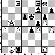 game notation in PGN-format [Event "around 1510"] [Site "www.myChess.de"] [Date "2005.03.07"] [Round "2"] [White "Festungsschach"] [Black "Seneca"] [ECO "B07"] [WhitemyELO "1579"] [BlackmyELO "1549"] [Result "0-1"] [TimeControl "10/864000"] [WhiteDays "10"] [BlackDays "10"] [MyChessNo "10953"] 1. e4 d6 2. d4 Nf6 3. Bd3 g6 4. h3 Nc6 5. d5 Ne5 6. Bg5 Bg7 7. Nf3 Nxd3+ 8. Qxd3 Nxe4 9. Nd4 Nxg5 10. Nd2 e5 11. Nb5 a6 12. Na3 f6 13. h4 Nf7 14. O-O-O Bf5 15. Qc4 b5 16. Qc3 Bh6 17. f3 Bd7 18. g4 Qb8 19. Kb1 Bxd2 20. Qxd2 Qb6 21. Rhe1 Nd8 22. g5 f5 23. f4 e4 24. Qc3 O-O 25. Qh3 Be8 26. c3 c6 27. dxc6 Qxc6 28. Nc2 Nb7 29. Nd4 Qd7 30. Rg1 Nc5 31. Ne2 Nd3 32. Qg3 Rc8 33. Nc1 Nxc1 34. Rxc1 Qe6 35. Qe3 Bf7 36. b3 a5 37. Qb6 a4 38. Qxb5 axb3 39. a4 b2 40. c4 bxc1=Q+ 0-1 position notation in FEN-format 2r2rk1/5b1p/3pq1p1/1Q3pP1/P1P1pP1P/8/8/1Kr3R1 - - - 0 41 Captured white pieces: Captured black pieces: Click on a captured piece in order to display the desired move!
