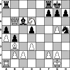 | game notation in PGN-format [Event "Schach f"] [Site "www.myChess.de"] [Date "2008.11.01"] [Round "2"] [Board "2"] [White "Andylein1989"] [Black "Papale"] [ECO "C42"] [WhitemyELO "1745"] [BlackmyELO "1778"] [Result "1-0"] [TimeControl "10/2592000"] [WhiteDays "30"] [BlackDays "30"] [MyChessNo "49362"] 1. e4 e5 2. Nf3 Nf6 3. Nc3 d6 4. Bc4 Be7 5. h3 O-O 6. d3 c6 7. Be3 b5 8. Bb3 a5 9. a4 b4 10. Ne2 Qc7 11. O-O Bb7 12. Ng3 d5 13. exd5 cxd5 14. Re1 e4 15. Nd4 Nbd7 16. Ngf5 Bd8 17. Nb5 Qe5 18. Nbd6 Bc6 19. Qc1 Ne8 20. Bd4 Qe6 21. Rxe4 Qg6 22. Rg4 Qxg4 23. hxg4 Nxd6 24. Nxd6 Bf6 25. Qf4 Bxd4 26. Qxd4 Nf6 27. g5 Nh5 28. Qb6 1-0 position notation in FEN-format r4rk1/5ppp/1QbN4/p2p2Pn/Pp6/1B1P4/1PP2PP1/R5K1 - - - 2 28 Captured white pieces:                              Captured black pieces:                               Click on a captured piece in order to display the desired move!