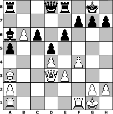 game notation in PGN-format [Event "wie w"] [Site "www.myChess.de"] [Date "2013.11.16"] [Round "1"] [White "Knight"] [Black "Wulfen49"] [ECO "A17"] [WhitemyELO "1189"] [BlackmyELO "1356"] [Result "0-1"] [TimeControl "10/1728000"] [WhiteDays "20"] [BlackDays "20"] [MyChessNo "91171"] 1. c4 Nf6 2. Nc3 e6 3. d4 Bb4 4. Nf3 d5 5. e3 O-O 6. Bd3 Nc6 7. c5 Bxc3+ 8. bxc3 Re8 9. O-O Ne4 10. Ne5 Nxc3 11. Qc2 Nxe5 12. Qxc3 Nxd3 13. Qxd3 c6 14. f4 b6 15. Ba3 a5 16. cxb6 Ba6 0-1 position notation in FEN-format r2qr1k1/5ppp/bPp1p3/p2p4/3P1P2/B2QP3/P5PP/R4RK1 - - - 1 17 Captured white pieces: Captured black pieces: Click on a captured piece in order to display the desired move!