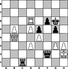 game notation in PGN-format [Event "Gunnis Spätsommerturnier"] [Site "www.myChess.de"] [Date "2018.09.07"] [Round "1"] [White "Gauss1233"] [Black "Haneken"] [ECO "A20"] [WhitemyELO "1378"] [BlackmyELO "1067"] [Result "0-1"] [TimeControl "10/2592000"] [WhiteDays "150"] [BlackDays "149"] [MyChessNo "113006"] 1. c4 e5 2. e4 Bb4 3. Nc3 c5 4. Nd5 Ba5 5. Be2 d6 6. Nf3 Be6 7. O-O Bxd5 8. cxd5 Nf6 9. Bb5+ Kf8 10. d3 a6 11. Ba4 b5 12. Bc2 b4 13. Bb3 Ng4 14. h3 Nf6 15. Bd2 h5 16. a3 g6 17. axb4 cxb4 18. Qc1 h4 19. Bg5 Kg7 20. Bxh4 Qe8 21. Ba4 Qg8 22. Qg5 Bd8 23. Qe3 Nbd7 24. Bxd7 Nxd7 25. Bxd8 Rxd8 26. Rxa6 Qf8 27. Rc1 Nb8 28. Ra7 Rd7 29. Rxd7 Nxd7 30. Qd2 b3 31. Rc7 Qd8 32. Qc3 Nc5 33. Ra7 Qb6 34. Ra1 Rh5 35. Nd2 f6 36. Ra3 g5 37. Nxb3 Nxb3 38. Rxb3 Qa6 39. Ra3 Qb7 40. b4 Kg6 41. Ra5 Qb6 42. b5 Rh7 43. Qb4 Rc7 44. Ra6 Rc1+ 45. Kh2 Qxf2 46. Rxd6 Qf4+ 47. g3 Qf2# 0-1 position notation in FEN-format 8/8/3R1pk1/1P1Pp1p1/1Q2P3/3P2PP/5q1K/2r5 - - - 1 48 Captured white pieces: Captured black pieces: Click on a captured piece in order to display the desired move!