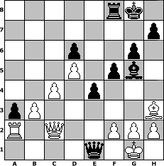 game notation in PGN-format [Event "Sweschnikow II"] [Site "www.myChess.de"] [Date "2012.04.28"] [Round "1"] [White "Joschi"] [Black "kari6katz"] [ECO "B33"] [WhitemyELO "1651"] [BlackmyELO "1756"] [Result "0-1"] [TimeControl "10/1728000"] [WhiteDays "19"] [BlackDays "19"] [MyChessNo "81299"] 1. e4 c5 2. Nf3 Nc6 3. d4 cxd4 4. Nxd4 Nf6 5. Nc3 e5 6. Ndb5 d6 7. Bg5 a6 8. Na3 b5 9. Nd5 Be7 10. Bxf6 Bxf6 11. c4 b4 12. Nc2 a5 13. b3 O-O 14. Be2 Be6 15. O-O Bg5 16. Bg4 Ne7 17. Nce3 g6 18. Qf3 Nxd5 19. Nxd5 Bxd5 20. exd5 f5 21. Bh3 a4 22. Qe2 axb3 23. axb3 Ra3 24. Qc2 e4 25. Rxa3 bxa3 26. Ra1 Qa5 27. Ra2 Qe1# 0-1 position notation in FEN-format 5rk1/7p/3p2p1/3P1pb1/2P1p3/pP5B/R1Q2PPP/4q1K1 - - - 4 28 Captured white pieces: Captured black pieces: Click on a captured piece in order to display the desired move!