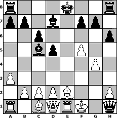 game notation in PGN-format [Event "November-Open (4)"] [Site "www.myChess.de"] [Date "2008.10.26"] [Round "1"] [White "werderfan"] [Black "DreiZweiEinsSchach"] [ECO "A40"] [WhitemyELO "1569"] [BlackmyELO "1138"] [Result "0-1"] [TimeControl "10/1728000"] [WhiteDays "20"] [BlackDays "19"] [MyChessNo "49094"] 1. d4 e5 2. dxe5 Nc6 3. Nf3 Qe7 4. Nc3 Nxe5 5. Nxe5 Qxe5 6. a3 Nf6 7. e3 c6 8. Be2 d5 9. O-O Bd6 10. f4 Qe7 11. f5 Bd7 12. g4 h6 13. e4 Nxe4 14. Nxe4 Qxe4 15. Re1 Bc5+ 16. Kf1 Qh1# 0-1 position notation in FEN-format r3k2r/pp1b1pp1/2p4p/2bp1P2/6P1/P7/1PPPB2P/R1BQRK1q - kq - 4 17 Captured white pieces: Captured black pieces: Click on a captured piece in order to display the desired move!