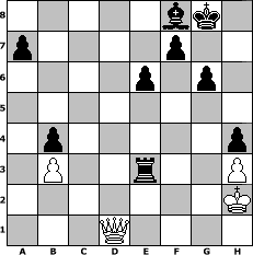 game notation in PGN-format [Event "Winter 2011/12"] [Site "www.myChess.de"] [Date "2011.12.22"] [Round "1"] [White "Lemmi11"] [Black "Jolilein"] [ECO "D02"] [WhitemyELO "1813"] [BlackmyELO "1906"] [Result "0-1"] [TimeControl "10/2592000"] [WhiteDays "179"] [BlackDays "150"] [MyChessNo "78353"] 1. d4 d5 2. Nf3 Nf6 3. g3 g6 4. Nc3 Bg7 5. Bg2 Nc6 6. Ne5 O-O 7. O-O Nxe5 8. dxe5 Nd7 9. f4 c6 10. e4 Qb6+ 11. Kh1 d4 12. Na4 Qa5 13. Qxd4 c5 14. Qc4 Nxe5 15. fxe5 Be6 16. Qxc5 Qxa4 17. b3 Qd7 18. Bb2 Rac8 19. Qf2 b5 20. Rac1 Qc7 21. Qf4 Rfd8 22. Rf2 h5 23. Bf3 b4 24. g4 Qb6 25. Kg2 h4 26. h3 Qa5 27. Ba1 Qxa2 28. g5 Qa6 29. Be2 Qb6 30. Bg4 Bxg4 31. Qxg4 Qe3 32. Rcf1 e6 33. Bb2 Rd2 34. Rxd2 Qxd2+ 35. Rf2 Qxc2 36. Rxc2 Rxc2+ 37. Kg1 Rxb2 38. Qd1 Bf8 39. Kf1 Be7 40. Qf3 Bxg5 41. Qg4 Bd8 42. Qf3 Bc7 43. Qe3 Bxe5 44. Qg5 Bg7 45. Qd8+ Bf8 46. Qd3 Rh2 47. Kg1 Ra2 48. Qd1 Ra5 49. Kg2 Rg5+ 50. Kh2 Rg3 51. e5 Re3 52. Kg2 Rxe5 53. Kh2 Re3 0-1 position notation in FEN-format 5bk1/p4p2/4p1p1/8/1p5p/1P2r2P/7K/3Q4 - - - 2 54 Captured white pieces: Captured black pieces: Click on a captured piece in order to display the desired move!