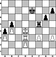 game notation in PGN-format [Event "Sommer 2015"] [Site "www.myChess.de"] [Date "2015.06.16"] [Round "1"] [White "martinus"] [Black "Gordholm"] [ECO "E90"] [WhitemyELO "1779"] [BlackmyELO "1511"] [Result "1/2-1/2"] [TimeControl "10/1728000"] [WhiteDays "100"] [BlackDays "027"] [MyChessNo "99463"] 1. d4 Nf6 2. c4 g6 3. Nc3 Bg7 4. e4 d6 5. Nf3 O-O 6. h3 e5 7. dxe5 dxe5 8. Qxd8 Rxd8 9. Nd5 Nxd5 10. cxd5 c6 11. Bg5 f6 12. Be3 b6 13. Bc4 Kh8 14. O-O-O Bf8 15. g4 Bb7 16. g5 cxd5 17. Bxd5 Bxd5 18. exd5 Nd7 19. gxf6 Rac8+ 20. Kb1 Nxf6 21. Bg5 Bg7 22. Nxe5 Rxd5 23. Bxf6 Rxd1+ 24. Rxd1 Bxf6 25. Nf7+ Kg8 26. Rd7 a5 27. Nh6+ Kh8 28. Nf7+ Kg8 29. Nh6+ Kh8 30. Ng4 Bg5 31. a3 Rc6 32. Ne5 Rc5 33. Nf7+ Kg8 34. Nxg5 Rxg5 35. Rd3 Rf5 36. f3 Kf7 37. Kc2 Ke7 38. Kc3 b5 39. b4 a4 40. Kd4 1/2-1/2 position notation in FEN-format 8/4k2p/6p1/1p3r2/pP1K4/P2R1P1P/3P4/8 - - - 1 40 Captured white pieces: Captured black pieces: Click on a captured piece in order to display the desired move!