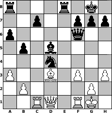 game notation in PGN-format [Event "OhneEngine vom Fr"] [Site "www.myChess.de"] [Date "2010.04.23"] [Round "1"] [White "Zargoz"] [Black "Hannes"] [ECO "D20"] [WhitemyELO "1500"] [BlackmyELO "1414"] [Result "1-0"] [TimeControl "10/2592000"] [WhiteDays "27"] [BlackDays "00"] [MyChessNo "65038"] 1. d4 d5 2. c4 dxc4 3. e3 e6 4. Bxc4 Nf6 5. Nc3 Bb4 6. Bd2 O-O 7. Nf3 Nc6 8. h3 a6 9. a3 Bxc3 10. Bxc3 b5 11. Bd3 Bb7 12. O-O Re8 13. Ng5 Qd5 14. e4 Qxg5 15. d5 exd5 16. Bxf6 Qxf6 17. exd5 Nd4 18. f3 Bxd5 19. Rc1 1-0 position notation in FEN-format r3r1k1/2p2ppp/p4q2/1p1b4/3n4/P2B1P1P/1P4P1/2RQ1RK1 - - - 1 19 Captured white pieces: ![]() ![]() ![]() ![]() ![]() ![]() ![]() ![]() ![]() ![]() ![]() ![]() ![]() ![]() ![]() Captured black pieces: ![]() ![]() ![]() ![]() ![]() ![]() ![]() ![]() ![]() ![]() ![]() ![]() ![]() ![]() ![]() Click on a captured piece in order to display the desired move!
