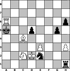 game notation in PGN-format [Event "In Memorium Michael Knopf"] [Site "www.myChess.de"] [Date "2012.04.10"] [Round "1"] [White "Wernburger"] [Black "Achimkogge"] [ECO "A27"] [WhitemyELO "1508"] [BlackmyELO "1421"] [Result "1-0"] [TimeControl "10/2592000"] [WhiteDays "148"] [BlackDays "142"] [MyChessNo "81106"] 1. c4 e5 2. Nc3 Nc6 3. Nf3 f6 4. e3 Bc5 5. a3 Nge7 6. b4 Nxb4 7. axb4 Bxb4 8. Qb3 c5 9. Be2 b6 10. O-O Bb7 11. Nb5 Qb8 12. Ba3 Bxa3 13. Rxa3 a6 14. Nc3 O-O 15. Qxb6 d6 16. Rb1 Bc6 17. Qxb8 Rfxb8 18. Rxb8+ Rxb8 19. Rxa6 h6 20. h3 e4 21. Ne1 Rb2 22. Ra2 Rb8 23. f3 f5 24. Kf2 g5 25. fxe4 fxe4 26. Bg4 Rf8+ 27. Ke2 Kg7 28. Ra7 Kf6 29. d3 exd3+ 30. Kxd3 Ng6 31. Nd5+ Bxd5 32. cxd5 Ke5 33. Bh5 Nh4 34. Re7+ Kxd5 35. g3 c4+ 36. Kc3 Rf1 37. Bf7+ Kc5 38. Nc2 Nf5 39. Rc7+ Kb6 40. Rxc4 Nxg3 41. Rb4+ Kc5 42. Rc4+ Kb6 43. Bd5 Ne2+ 44. Kd2 Rf2 45. Rc6+ Ka5 46. Ke1 Rh2 47. Bc4 Rh1+ 48. Kd2 d5 49. Ra6# 1-0 position notation in FEN-format 8/8/R6p/k2p2p1/2B5/4P2P/2NKn3/7r - - - 1 49 Captured white pieces: ![]() ![]() ![]() ![]() ![]() ![]() ![]() ![]() ![]() ![]() ![]() ![]() ![]() ![]() ![]() Captured black pieces: ![]() ![]() ![]() ![]() ![]() ![]() ![]() ![]() ![]() ![]() ![]() ![]() ![]() ![]() ![]() Click on a captured piece in order to display the desired move!