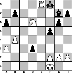 game notation in PGN-format [Event "STHLM"] [Site "www.myChess.de"] [Date "2010.03.25"] [Round "1"] [White "Schmalte"] [Black "lasker"] [ECO "C41"] [WhitemyELO "1393"] [BlackmyELO "1408"] [Result "1-0"] [TimeControl "10/1728000"] [WhiteDays "35"] [BlackDays "31"] [MyChessNo "64291"] 1. e4 e5 2. Nf3 d6 3. c3 Nf6 4. d3 Be7 5. Bg5 O-O 6. Bxf6 Bxf6 7. d4 exd4 8. cxd4 Nc6 9. a3 Bg4 10. Be2 Re8 11. Nc3 Bxf3 12. Bxf3 Nxd4 13. O-O O-O+ 14. Qxf3 a6 15. Rac1 Be5 16. Rc2 g6 17. Nd5 c6 18. Ne3 Bg7 19. Re1 Qd7 20. b4 d5 21. exd5 Qxd5 22. Qxd5 cxd5 23. Kf1 d4 24. Nd5 Rac8 25. Rxc8 Rexc8 26. Ne7+ Kf8 27. Nxc8 f5 28. Nd6 d3 29. Re8# 1-0 position notation in FEN-format 4Rk2/1p4bp/p2N2p1/5p2/1P6/P2p4/5PPP/5K2 - - - 1 29 Captured white pieces: Captured black pieces: Click on a captured piece in order to display the desired move!