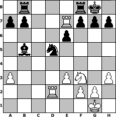 game notation in PGN-format [Event "Dann mal los"] [Site "www.myChess.de"] [Date "2006.09.24"] [Round "1"] [White "Chelly"] [Black "ujack1961"] [ECO "D02"] [WhitemyELO "1747"] [BlackmyELO "1816"] [Result "0-1"] [TimeControl "10/864000"] [WhiteDays "30"] [BlackDays "30"] [MyChessNo "28875"] 1. d4 d5 2. Nf3 e6 3. Bd2 Nf6 4. e3 Bd6 5. c4 O-O 6. a3 c5 7. dxc5 Bxc5 8. Nc3 Nc6 9. b4 Be7 10. Be2 dxc4 11. Bxc4 Qc7 12. O-O Nxb4 13. Qb3 Nc6 14. Rfd1 Na5 15. Nb5 Qxc4 16. Qxc4 Nxc4 17. Rac1 Nxd2 18. Rxd2 Bd7 19. Rc7 Bxb5 20. Rxe7 Rab8 21. h3 Nd5 0-1 position notation in FEN-format 1r3rk1/pp2Rppp/4p3/1b1n4/8/P3PN1P/3R1PP1/6K1 - - - 1 22 Captured white pieces: Captured black pieces: Click on a captured piece in order to display the desired move!