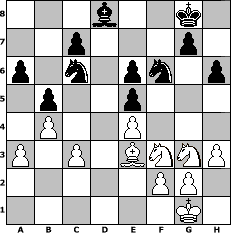 game notation in PGN-format [Event "unter uns Nr. 45 Adventturnier"] [Site "www.myChess.de"] [Date "2018.11.20"] [Round "1"] [White "faustballer"] [Black "lotchi"] [ECO "C24"] [WhitemyELO "1460"] [BlackmyELO "1021"] [Result "1-0"] [TimeControl "10/864000"] [WhiteDays "30"] [BlackDays "00"] [MyChessNo "113491"] 1. e4 e5 2. Bc4 Nf6 3. d3 Nc6 4. a3 d6 5. h3 Be6 6. Bxe6 fxe6 7. Nf3 h6 8. Nc3 a6 9. O-O Qd7 10. b4 Be7 11. Ne2 O-O 12. c3 b5 13. Nh2 d5 14. Ng3 dxe4 15. dxe4 Qxd1 16. Rxd1 Rfd8 17. Be3 Rxd1+ 18. Rxd1 Rd8 19. Rxd8+ Bxd8 20. Nf3 1-0 position notation in FEN-format 3b2k1/2p3p1/p1n1pn1p/1p2p3/1P2P3/P1P1BNNP/5PP1/6K1 - - - 1 20 Captured white pieces: Captured black pieces: Click on a captured piece in order to display the desired move!