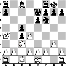 game notation in PGN-format [Event "Winter 2011/12"] [Site "www.myChess.de"] [Date "2011.12.22"] [Round "1"] [White "Baehr008"] [Black "retep1"] [ECO "?"] [WhitemyELO "1989"] [BlackmyELO "1805"] [Result "0-1"] [TimeControl "10/2592000"] [WhiteDays "12"] [BlackDays "60"] [MyChessNo "78381"] 1. d4 Nf6 2. c4 e6 3. Nc3 d5 4. Nf3 Be7 5. g3 O-O 6. Bg2 dxc4 7. Ne5 Nc6 8. Bxc6 bxc6 9. Nxc6 Qe8 10. Nxe7+ Qxe7 11. Qa4 c5 0-1 position notation in FEN-format r1b2rk1/p3qppp/4pn2/2p5/Q1pP4/2N3P1/PP1PPP1P/R1B1K2R - KQ - 0 12 Captured white pieces: Captured black pieces: Click on a captured piece in order to display the desired move!