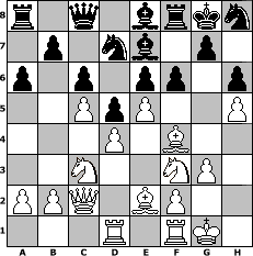 game notation in PGN-format [Event "?"] [Site "www.myChess.de"] [Date "2025.09.02"] [Round "?"] [White "Yukiki"] [Black "Winston"] [ECO "A13"] [WhitemyELO "1542"] [BlackmyELO "1486"] [Result "0-1"] [TimeControl "10/864000"] [WhiteDays "00"] [BlackDays "10"] [MyChessNo "133621"] 1. c4 e6 2. e4 a6 3. Nc3 d6 4. d4 c6 5. Nf3 h6 6. Be2 Ne7 7. O-O Ng6 8. Be3 Qc7 9. Qa4 Bd7 10. Qc2 Be7 11. Rad1 O-O 12. c5 d5 13. g3 Be8 14. h4 Nd7 15. h5 Nh8 16. Bf4 Qc8 17. e5 f6 0-1 position notation in FEN-format r1q1brkn/1p1nb1p1/p1p1pp1p/2PpP2P/3P1B2/2N2NP1/PPQ1BP2/3R1RK1 - - - 0 18 Captured white pieces: Captured black pieces: Click on a captured piece in order to display the desired move!