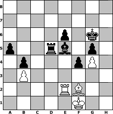 game notation in PGN-format [Event "Anti-Skandinavisch oder Schach ist kein Tennis"] [Site "www.myChess.de"] [Date "2011.10.01"] [Round "2"] [White "martinus"] [Black "woern63"] [ECO "A06"] [WhitemyELO "1733"] [BlackmyELO "1896"] [Result "0-1"] [TimeControl "10/1728000"] [WhiteDays "20"] [BlackDays "20"] [MyChessNo "76543"] 1. Nf3 d5 2. e4 dxe4 3. Ng5 Qd5 4. d4 Nc6 5. Nc3 Qxd4 6. Be3 Qxd1+ 7. Rxd1 Bf5 8. Ngxe4 Nf6 9. f3 Bxe4 10. Nxe4 Nxe4 11. fxe4 e6 12. Bb5 Bd6 13. O-O a6 14. Bd3 Nb4 15. a3 Nxd3 16. cxd3 O-O 17. d4 c6 18. Rc1 f5 19. e5 Be7 20. Rc3 Rad8 21. g3 g5 22. Rf2 Kf7 23. Kg2 h5 24. h3 Rg8 25. Rb3 Rd7 26. g4 hxg4 27. hxg4 f4 28. Bd2 b5 29. Rd3 c5 30. Bc3 Rgd8 31. Rh3 b4 32. axb4 cxb4 33. Be1 Kg6 34. Kf1 Rxd4 35. Rfh2 Bf8 36. Rh8 Bg7 37. Rxd8 Rxd8 38. Re2 a5 39. Bf2 Rd5 40. b3 Bxe5 0-1 position notation in FEN-format 8/8/4p1k1/p2rb1p1/1p3pP1/1P6/4RB2/5K2 - - - 0 41 Captured white pieces: ![]() ![]() ![]() ![]() ![]() ![]() ![]() ![]() ![]() ![]() ![]() ![]() ![]() ![]() ![]() Captured black pieces: ![]() ![]() ![]() ![]() ![]() ![]() ![]() ![]() ![]() ![]() ![]() ![]() ![]() ![]() ![]() Click on a captured piece in order to display the desired move!