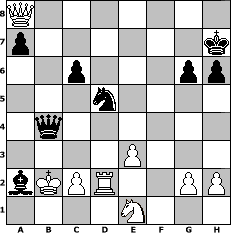 game notation in PGN-format [Event "Gary COME BACK Turnier"] [Site "www.myChess.de"] [Date "2005.03.18"] [Round "1"] [White "Knight"] [Black "Chaos"] [ECO "A45"] [WhitemyELO "1325"] [BlackmyELO "1730"] [Result "0-1"] [TimeControl "10/1728000"] [WhiteDays "19"] [BlackDays "15"] [MyChessNo "11254"] 1. d4 Nf6 2. Nc3 g6 3. e4 d6 4. Nf3 Bg7 5. Bg5 h6 6. Be3 c6 7. Bd3 b5 8. e5 Ng4 9. Qe2 Na6 10. Nxb5 Nxe3 11. Nxd6+ exd6 12. exd6 O-O 13. Qxe3 Re8 14. Be4 f5 15. Qb3+ Kh7 16. O-O-O Rxe4 17. Rhe1 Qxd6 18. Qf7 Be6 19. Qb7 Nc7 20. Rxe4 fxe4 21. Ne1 Bxa2 22. d5 Nxd5 23. Qxa8 Qf4+ 24. Rd2 e3 25. fxe3 Bxb2+ 26. Kxb2 Qb4+ 0-1 position notation in FEN-format Q7/p6k/2p3pp/3n4/1q6/4P3/bKPR2PP/4N3 - - - 1 27 Captured white pieces: Captured black pieces: Click on a captured piece in order to display the desired move!