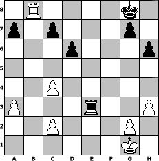game notation in PGN-format [Event "Drei Pferde zu Weihnachten"] [Site "www.myChess.de"] [Date "2009.12.20"] [Round "1"] [White "frankto"] [Black "rakl"] [ECO "C47"] [WhitemyELO "1688"] [BlackmyELO "1849"] [Result "1/2-1/2"] [TimeControl "10/864000"] [WhiteDays "40"] [BlackDays "18"] [MyChessNo "61722"] 1. e4 e5 2. Nf3 Nc6 3. Nc3 Nf6 4. d4 Bb4 5. Nxe5 O-O 6. Qd3 Re8 7. Nxc6 bxc6 8. Bg5 h6 9. Bxf6 Qxf6 10. Be2 c5 11. a3 Ba5 12. dxc5 Ba6 13. Qf3 Bxc3+ 14. bxc3 Qc6 15. Bxa6 Qxa6 16. Qd3 Qc6 17. f3 Re5 18. Rb1 Rxc5 19. Rb3 Re8 20. O-O f5 21. Rfb1 fxe4 22. fxe4 Rce5 23. Rb8 Rxe4 24. Rxe8+ Rxe8 25. h3 d6 26. c4 Qc5+ 27. Kh2 Qe5+ 28. Kg1 Qe3+ 29. Qxe3 Rxe3 30. Rb8+ 1/2-1/2 position notation in FEN-format 1R4k1/p1p3p1/3p3p/8/2P5/P3r2P/2P3P1/6K1 - - - 1 30 Captured white pieces: Captured black pieces: Click on a captured piece in order to display the desired move!