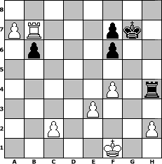 game notation in PGN-format [Event "PUNSCH-Turnier"] [Site "www.myChess.de"] [Date "2010.10.18"] [Round "1"] [White "haggard"] [Black "Knight"] [ECO "A20"] [WhitemyELO "1814"] [BlackmyELO "1201"] [Result "1-0"] [TimeControl "10/2592000"] [WhiteDays "30"] [BlackDays "30"] [MyChessNo "69036"] 1. c4 e5 2. g3 Nf6 3. Bg2 d5 4. cxd5 Nxd5 5. Nc3 Nb6 6. Nf3 Nc6 7. O-O Bc5 8. a3 O-O 9. b4 Bd6 10. d3 Bf5 11. b5 Nd4 12. e3 Nxf3+ 13. Bxf3 Rb8 14. Bb2 Bh3 15. Re1 Re8 16. a4 Bb4 17. a5 Nd7 18. d4 e4 19. Bxe4 Bxc3 20. Bxh7+ Kxh7 21. Qh5+ Kg8 22. Bxc3 Be6 23. d5 Bxd5 24. Qxd5 Nf6 25. Qxd8 Rbxd8 26. Bxf6 gxf6 27. Rec1 Rd7 28. a6 b6 29. Rd1 Rxd1+ 30. Rxd1 Re5 31. Rc1 Re7 32. g4 Re5 33. Rxc7 Rxb5 34. Rxa7 Rg5 35. Kf1 Rxg4 36. f4 Kg7 37. Rb7 Rh4 38. a7 1-0 position notation in FEN-format 8/PR3pk1/1p3p2/8/5P1r/4P3/2P4P/5K2 - - - 0 38 Captured white pieces: ![]() ![]() ![]() ![]() ![]() ![]() ![]() ![]() ![]() ![]() ![]() ![]() ![]() ![]() ![]() Captured black pieces: ![]() ![]() ![]() ![]() ![]() ![]() ![]() ![]() ![]() ![]() ![]() ![]() ![]() ![]() ![]() Click on a captured piece in order to display the desired move!