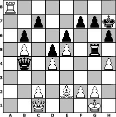game notation in PGN-format [Event "Loyal to the Game"] [Site "www.myChess.de"] [Date "2005.12.23"] [Round "1"] [White "Antaeus"] [Black "Andreas"] [ECO "A15"] [WhitemyELO "1429"] [BlackmyELO "1641"] [Result "1-0"] [TimeControl "10/864000"] [WhiteDays "10"] [BlackDays "09"] [MyChessNo "21011"] 1. c4 Nf6 2. d4 e6 3. Bg5 Be7 4. c5 Nc6 5. Nf3 h6 6. Bxf6 Bxf6 7. Nc3 O-O 8. e3 b6 9. cxb6 axb6 10. Be2 Bb7 11. O-O d6 12. e4 Ra5 13. a3 Qe7 14. Qd2 Rfa8 15. Rfc1 Bg5 16. Nxg5 Rxg5 17. Nb5 Ba6 18. a4 Bxb5 19. axb5 Na5 20. b4 Nb3 21. Rxa8+ Kh7 22. Qc3 Nxc1 23. Qxc1 d5 24. e5 Qxb4 25. h4 1-0 position notation in FEN-format R7/2p2ppk/1p2p2p/1P1pP1r1/1q1P3P/8/2P1BPP1/2Q3K1 - - - 0 25 Captured white pieces: Captured black pieces: Click on a captured piece in order to display the desired move!