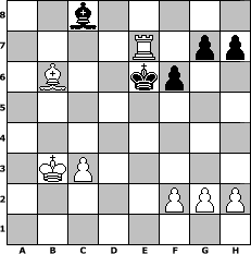 game notation in PGN-format [Event "Wrixum - Open die X"] [Site "www.myChess.de"] [Date "2012.10.06"] [Round "1"] [White "Knight"] [Black "OwainGwynedd"] [ECO "D00"] [WhitemyELO "1032"] [BlackmyELO "1385"] [Result "1/2-1/2"] [TimeControl "10/2592000"] [WhiteDays "150"] [BlackDays "139"] [MyChessNo "84292"] 1. d4 d5 2. e4 e5 3. dxe5 dxe4 4. Qxd8+ Kxd8 5. Nc3 Bf5 6. Be3 Nc6 7. O-O-O+ Bd7 8. Nxe4 Nxe5 9. Bb5 c6 10. Ba4 Kc7 11. Ne2 Be6 12. Nf4 Bxa2 13. b3 Ba3+ 14. Kd2 Bb2 15. Ke2 b5 16. Bxb5 cxb5 17. Rd5 a6 18. Rc5+ Nc6 19. Nd5+ Kd8 20. Rxc6 Ne7 21. Bb6+ Kd7 22. Nxe7 Kxe7 23. Bc5+ Kd7 24. Rd6+ Kc7 25. Rhd1 Rac8 26. Bb6+ Kb8 27. R1d2 Bb1 28. Nc5 Ba3 29. b4 Bxb4 30. Nxa6+ Kb7 31. Nxb4 Rhe8+ 32. Be3 Re7 33. Rb6+ Ka8 34. Rxb5 Rb8 35. Rxb8+ Kxb8 36. Nc6+ Kb7 37. Nd8+ Kc7 38. Kd1 Ba2 39. Kc1 f6 40. c3 Bc4 41. Kb2 Bb5 42. Kb3 Bd7 43. Ra2 Kxd8 44. Ra8+ Bc8 45. Bb6+ Kd7 46. Ra7+ Ke6 47. Rxe7+ 1/2-1/2 position notation in FEN-format 2b5/4R1pp/1B2kp2/8/8/1KP5/5PPP/8 - - - 0 47 Captured white pieces: Captured black pieces: Click on a captured piece in order to display the desired move!