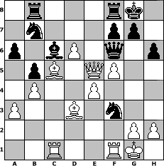 game notation in PGN-format [Event "Najdorf mit f4"] [Site "www.myChess.de"] [Date "2022.02.01"] [Round "2"] [White "Seneca"] [Black "Rotstift10"] [ECO "B93"] [WhitemyELO "1533"] [BlackmyELO "1599"] [Result "0-1"] [TimeControl "10/2592000"] [WhiteDays "74"] [BlackDays "83"] [MyChessNo "124521"] 1. e4 c5 2. Nf3 d6 3. d4 cxd4 4. Nxd4 Nf6 5. Nc3 a6 6. f4 e5 7. Nf3 Nc6 8. f5 h6 9. a3 b5 10. Bd3 Qb6 11. Qe2 Be7 12. Be3 Qd8 13. O-O Nh7 14. Nd5 Rb8 15. Nxe7 Qxe7 16. b4 Bd7 17. c4 Nd8 18. Rac1 O-O 19. c5 Bc6 20. cxd6 Qf6 21. Bc5 Nb7 22. Qb2 Ng5 23. Qxe5 Nxf3+ 0-1 position notation in FEN-format 1r3rk1/1n3pp1/p1bP1q1p/1pB1QP2/1P2P3/P2B1n2/6PP/2R2RK1 - - - 0 24 Captured white pieces: Captured black pieces: Click on a captured piece in order to display the desired move!