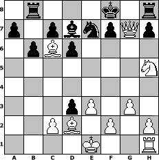 game notation in PGN-format [Event "Ja, is denn heut scho Weihnachten?"] [Site "www.myChess.de"] [Date "2014.12.06"] [Round "1"] [White "haggard"] [Black "MiFie"] [ECO "A20"] [WhitemyELO "1992"] [BlackmyELO "1052"] [Result "1-0"] [TimeControl "10/2592000"] [WhiteDays "90"] [BlackDays "76"] [MyChessNo "97065"] 1. c4 e5 2. g3 Bc5 3. Bg2 Qf6 4. e3 Nc6 5. Nc3 Nge7 6. Ne4 Qe6 7. Nxc5 Qxc4 8. d4 Qb4+ 9. Bd2 Qxb2 10. Rb1 Qxa2 11. Qc1 d6 12. Ra1 Qxa1 13. Qxa1 exd4 14. Ne4 Nf5 15. Ne2 d3 16. Nf4 b6 17. Nf6+ Kf8 18. Bxc6 Rb8 19. N4h5 Ne7 20. Nd7+ Bxd7 21. Qxg7+ 1-0 position notation in FEN-format 1r3k1r/p1pbnpQp/1pBp4/7N/8/3pP1P1/2PB1P1P/4K2R - K - 0 21 Captured white pieces: ![]() ![]() ![]() ![]() ![]() ![]() ![]() ![]() ![]() ![]() ![]() ![]() ![]() ![]() ![]() Captured black pieces: ![]() ![]() ![]() ![]() ![]() ![]() ![]() ![]() ![]() ![]() ![]() ![]() ![]() ![]() ![]() Click on a captured piece in order to display the desired move!