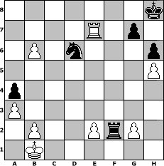 game notation in PGN-format [Event "Fr"] [Site "www.myChess.de"] [Date "2005.04.22"] [Round "1"] [White "Hondo"] [Black "Baehr008"] [ECO "B19"] [WhitemyELO "1623"] [BlackmyELO "1742"] [Result "1/2-1/2"] [TimeControl "10/1728000"] [WhiteDays "80"] [BlackDays "80"] [MyChessNo "12319"] 1. e4 c6 2. d4 d5 3. Nc3 dxe4 4. Nxe4 Bf5 5. Ng3 Bg6 6. h4 h6 7. Nf3 Nd7 8. h5 Bh7 9. Bd3 Bxd3 10. Qxd3 Ngf6 11. Bf4 e6 12. O-O-O Be7 13. Kb1 O-O 14. Rhe1 a5 15. Ne5 a4 16. a3 Nd5 17. Bc1 Nxe5 18. dxe5 Qc7 19. c4 Nb6 20. Ne4 Rad8 21. Nd6 Nd7 22. Qg3 Kh8 23. Bf4 Qb6 24. Qe3 Qxe3 25. Rxe3 Nc5 26. Rc3 Ne4 27. Rc2 f6 28. c5 fxe5 29. Bxe5 b6 30. cxb6 Bxd6 31. Bxd6 Rxd6 32. Rxd6 Nxd6 33. Rxc6 Nb7 34. Rxe6 Rxf2 35. Re7 Nd6 1/2-1/2 position notation in FEN-format 7k/4R1p1/1P1n3p/7P/p7/P7/1P2PrP1/1K6 - - - 2 36 Captured white pieces: ![]() ![]() ![]() ![]() ![]() ![]() ![]() ![]() ![]() ![]() ![]() ![]() ![]() ![]() ![]() Captured black pieces: ![]() ![]() ![]() ![]() ![]() ![]() ![]() ![]() ![]() ![]() ![]() ![]() ![]() ![]() ![]() Click on a captured piece in order to display the desired move!