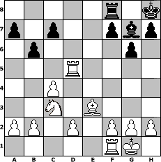 game notation in PGN-format [Event "1.Schaltjahresturnier@mySchach"] [Site "www.myChess.de"] [Date "2004.02.29"] [Round "2"] [White "NoBody"] [Black "Knight"] [ECO "A40"] [WhitemyELO "1833"] [BlackmyELO "1356"] [Result "1-0"] [TimeControl "10/1728000"] [WhiteDays "60"] [BlackDays "60"] [MyChessNo "2649"] 1. d4 g6 2. e4 Bg7 3. Nf3 d5 4. exd5 Qxd5 5. c4 Qe6+ 6. Be2 Nc6 7. d5 Qd7 8. dxc6 Qxc6 9. O-O Nf6 10. Nc3 O-O 11. Nd4 Qd7 12. Be3 b6 13. Bf3 Rb8 14. Nc6 Qxd1 15. Raxd1 Ra8 16. Nxe7+ Kh8 17. Bxa8 Be6 18. Bd5 Nxd5 19. Nexd5 Bxd5 20. Rxd5 1-0 position notation in FEN-format 5r1k/p1p2pbp/1p4p1/3R4/2P5/2N1B3/PP1P1PPP/5RK1 - - - 0 20 Captured white pieces: Captured black pieces: Click on a captured piece in order to display the desired move!