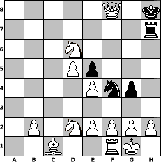 game notation in PGN-format [Event "Clubmeisterschaft der Oldies"] [Site "www.myChess.de"] [Date "2007.04.13"] [Round "1"] [White "thw"] [Black "muckelmaus"] [ECO "C41"] [WhitemyELO "1526"] [BlackmyELO "1486"] [Result "1-0"] [TimeControl "10/1728000"] [WhiteDays "80"] [BlackDays "73"] [MyChessNo "34091"] 1. e4 e5 2. Nf3 d6 3. d4 Nc6 4. Bb5 Be7 5. d5 a6 6. Ba4 b5 7. Bb3 Na5 8. c4 h6 9. cxb5 Nf6 10. Bc2 axb5 11. a4 bxa4 12. Nc3 Nc4 13. Bxa4+ Bd7 14. Qb3 Bxa4 15. Rxa4 Nb6 16. Rxa8 Qxa8 17. O-O Nh5 18. Nb5 g5 19. Nxc7+ Kd7 20. Nxa8 g4 21. Nxb6+ Ke8 22. Qb5+ Kf8 23. Nd2 Nf4 24. Nc8 Rg8 25. Qd7 Nd3 26. Qxe7+ Kg7 27. Nxd6 Nf4 28. Qxf7+ Kh8 29. Qf6+ Rg7 30. Qxh6+ Rh7 31. Qf8# 1-0 position notation in FEN-format 5Q1k/7r/3N4/3Pp3/4Pnp1/8/1P1NPPPP/2B2RK1 - - - 2 31 Captured white pieces: Captured black pieces: Click on a captured piece in order to display the desired move!