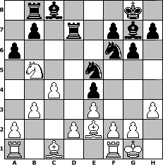 game notation in PGN-format [Event "Karnevalsstress"] [Site "www.myChess.de"] [Date "2009.02.15"] [Round "1"] [White "edudoc32"] [Black "martinus"] [ECO "E60"] [WhitemyELO "1804"] [BlackmyELO "1877"] [Result "0-1"] [TimeControl "10/1728000"] [WhiteDays "40"] [BlackDays "40"] [MyChessNo "52812"] 1. d4 Nf6 2. c4 g6 3. Nf3 Bg7 4. e3 d6 5. Be2 O-O 6. O-O Re8 7. h3 Nc6 8. Nc3 e5 9. dxe5 dxe5 10. Qxd8 Rxd8 11. Nb5 e4 12. Ne5 Nxe5 13. Nxc7 Rb8 14. b3 Rd7 15. Nb5 a6 0-1 position notation in FEN-format 1rb3k1/1p1r1pbp/p4np1/1N2n3/2P1p3/1P2P2P/P2PBPP1/R1B2RK1 - - - 0 16 Captured white pieces: Captured black pieces: Click on a captured piece in order to display the desired move!