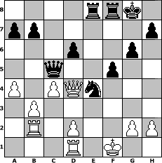 game notation in PGN-format [Event "Schlusslichterturnier Nr.2"] [Site "www.myChess.de"] [Date "2010.10.25"] [Round "1"] [White "Knight"] [Black "hape50"] [ECO "A40"] [WhitemyELO "1185"] [BlackmyELO "1352"] [Result "0-1"] [TimeControl "10/2592000"] [WhiteDays "30"] [BlackDays "30"] [MyChessNo "69300"] 1. d4 g6 2. Nc3 Bg7 3. Nf3 Nf6 4. e4 d6 5. Bb5+ Bd7 6. Bxd7+ Nbxd7 7. O-O c6 8. d5 cxd5 9. exd5 Nb6 10. Bf4 Nh5 11. Be3 Nc4 12. Rb1 O-O 13. b3 Nxe3 14. fxe3 Bxc3 15. a4 Qb6 16. Qe2 Nf4 17. Qf2 Nxd5 18. Nd4 Bxd4 19. exd4 f5 20. c4 Nc3 21. Rb2 Ne4 22. Qe3 e5 23. Rd1 Rae8 24. Kf1 exd4 25. Qxd4 Qc5 0-1 position notation in FEN-format 4rrk1/pp5p/3p2p1/2q2p2/P1PQn3/1P6/1R1P2PP/3R1K2 - - - 1 26 Captured white pieces: Captured black pieces: Click on a captured piece in order to display the desired move!