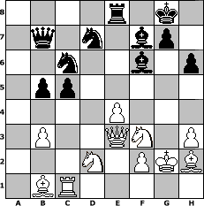 game notation in PGN-format [Event "1. MNS Clubmeisterschaft 2013"] [Site "www.myChess.de"] [Date "2013.01.02"] [Round "1"] [White "HenrySchinasky"] [Black "deepsabel"] [ECO "C91"] [WhitemyELO "2113"] [BlackmyELO "2003"] [Result "1/2-1/2"] [TimeControl "10/2592000"] [WhiteDays "30"] [BlackDays "27"] [MyChessNo "85897"] 1. e4 e5 2. Nf3 Nc6 3. Bb5 a6 4. Ba4 Nf6 5. O-O Be7 6. Re1 b5 7. Bb3 d6 8. c3 O-O 9. d4 Bg4 10. Be3 exd4 11. cxd4 Na5 12. Bc2 c5 13. dxc5 dxc5 14. Nbd2 Nc6 15. h3 Bh5 16. b3 Nd7 17. a4 Nb4 18. axb5 axb5 19. Rxa8 Qxa8 20. Bb1 Rd8 21. Qe2 Qa6 22. g4 Bg6 23. Rc1 f6 24. Bf4 Qb6 25. Rd1 Bf7 26. Bg3 Bf8 27. Re1 Re8 28. g5 Be7 29. Qe3 Nc6 30. gxf6 Bxf6 31. Kg2 h6 32. Rc1 Qb7 33. Bh2 1/2-1/2 position notation in FEN-format 4r1k1/1q1n1bp1/2n2b1p/1pp5/4P3/1P2QN1P/3N1PKB/1BR5 - - - 3 33 Captured white pieces: Captured black pieces: Click on a captured piece in order to display the desired move!