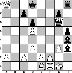 game notation in PGN-format [Event "Impfen ist Pflicht :-)"] [Site "www.myChess.de"] [Date "2021.04.29"] [Round "1"] [White "MiFie"] [Black "Hobbykegler"] [ECO "C47"] [WhitemyELO "1035"] [BlackmyELO "1051"] [Result "1-0"] [TimeControl "10/2592000"] [WhiteDays "88"] [BlackDays "48"] [MyChessNo "122031"] 1. e4 e5 2. Nf3 Nc6 3. Nc3 Nf6 4. Bc4 Nd4 5. Nxe5 Qe7 6. Bxf7+ Kd8 7. O-O d6 8. Nf3 Nxf3+ 9. Qxf3 Qxf7 10. h3 h5 11. d3 Be6 12. Bg5 a5 13. Rae1 Qg6 14. h4 Bg4 15. Qf4 Be7 16. Nd5 Nxd5 17. exd5 Bxg5 18. Qd4 Bxh4 19. g3 Bg5 20. b4 axb4 21. Qxb4 Bh3 22. Qxb7 Bh4 23. Qxa8+ 1-0 position notation in FEN-format Q2k3r/2p3p1/3p2q1/3P3p/7b/3P2Pb/P1P1PP2/4RRK1 - - - 0 23 Captured white pieces: Captured black pieces: Click on a captured piece in order to display the desired move!
