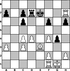game notation in PGN-format [Event "MySchachOpen"] [Site "www.myChess.de"] [Date "2005.01.22"] [Round "1"] [White "bjeu"] [Black "Master1"] [ECO "C20"] [WhitemyELO "1667"] [BlackmyELO "1238"] [Result "1-0"] [TimeControl "10/2592000"] [WhiteDays "90"] [BlackDays "90"] [MyChessNo "9847"] 1. e4 e5 2. g3 Nf6 3. Bg2 d5 4. exd5 Nxd5 5. Ne2 Be6 6. O-O Bg4 7. c4 Nf4 8. gxf4 Bxe2 9. Qxe2 Nc6 10. Bxc6+ bxc6 11. Qxe5+ Qe7 12. d4 O-O-O 13. Qf5+ Qd7 14. Qxd7+ Rxd7 15. Be3 f6 16. Nc3 Bb4 17. a3 Bxc3 18. bxc3 h6 19. Rab1 g5 20. Rb2 Kd8 21. Rb8+ Ke7 22. Rxh8 g4 23. Rh7+ 1-0 position notation in FEN-format 8/p1prk2R/2p2p1p/8/2PP1Pp1/P1P1B3/5P1P/5RK1 - - - 1 23 Captured white pieces: Captured black pieces: Click on a captured piece in order to display the desired move!