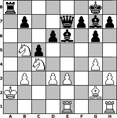 game notation in PGN-format [Event "Make myChess great again...."] [Site "www.myChess.de"] [Date "2017.02.11"] [Round "1"] [White "wolni55"] [Black "pepo47"] [ECO "C42"] [WhitemyELO "1452"] [BlackmyELO "2075"] [Result "0-1"] [TimeControl "10/864000"] [WhiteDays "00"] [BlackDays "30"] [MyChessNo "106892"] 1. e4 e5 2. Nf3 Nf6 3. Nxe5 d6 4. Nf3 Nxe4 5. Qe2 Qe7 6. h3 g6 7. d3 Nf6 8. Be3 Bg7 9. Na3 O-O 10. O-O-O Re8 11. g4 Nd5 12. Re1 Nxe3 13. fxe3 Be6 14. Kb1 c5 15. Bg2 Nc6 16. Nd2 Nb4 17. b3 a5 18. Nb5 a4 19. Nc4 axb3 20. cxb3 Rxa2 21. Qxa2 Nxa2 22. Kxa2 Ra8+ 0-1 position notation in FEN-format r5k1/1p2qpbp/3pb1p1/1Np5/2N3P1/1P1PP2P/K5B1/4R2R - - - 1 23 Captured white pieces: Captured black pieces: Click on a captured piece in order to display the desired move!