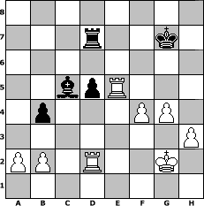 game notation in PGN-format [Event "4. Frankenwaldturnier"] [Site "www.myChess.de"] [Date "2007.09.06"] [Round "1"] [White "ujack1961"] [Black "muellerh"] [ECO "C00"] [WhitemyELO "1794"] [BlackmyELO "1502"] [Result "1-0"] [TimeControl "10/864000"] [WhiteDays "10"] [BlackDays "10"] [MyChessNo "37920"] 1. e4 e6 2. e5 d5 3. d4 c5 4. Be3 cxd4 5. Bxd4 Nc6 6. Bb5 Bd7 7. Bxc6 Bxc6 8. Nf3 Ne7 9. O-O Nf5 10. c3 Be7 11. Qe2 a6 12. Rd1 O-O 13. h3 f6 14. Nbd2 Rc8 15. exf6 Nxd4 16. Nxd4 Rxf6 17. Nxe6 Qd6 18. Nxg7 Rcf8 19. Ne4 Qe5 20. Nxf6+ Qxf6 21. Ne6 Rf7 22. Rd3 Bb5 23. Rg3+ Kh8 24. Qg4 Qg6 25. Qxg6 hxg6 26. Rxg6 Bd7 27. Re1 Bxe6 28. Rgxe6 Bc5 29. R1e2 Kg7 30. g4 a5 31. Kg2 b5 32. R6e5 Rd7 33. f4 b4 34. cxb4 axb4 35. Rd2 1-0 position notation in FEN-format 8/3r2k1/8/2bpR3/1p3PP1/7P/PP1R2K1/8 - - - 1 35 Captured white pieces: Captured black pieces: Click on a captured piece in order to display the desired move!