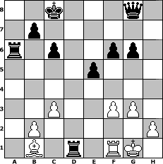 game notation in PGN-format [Event "Mit Chess960 durch\' s Jahr"] [Site "www.myChess.de"] [Date "2010.05.31"] [Round "2"] [White "sterpfi"] [Black "Erich"] [Variant "Fischerrandom"] [SetUp "1"] [FEN "rbkrqnbn/pppppppp/8/8/8/8/PPPPPPPP/RBKRQNBN w KQkq - 0 1"] [WhitemyELO "1538"] [BlackmyELO "1862"] [Result "0-1"] [TimeControl "10/2592000"] [WhiteDays "70"] [BlackDays "90"] [MyChessNo "65936"] 1. e4 e5 2. Nhg3 Nhg6 3. Nf5 Ne6 4. g3 Ne7 5. N1e3 c6 6. d4 Nxf5 7. Nxf5 g6 8. Nh6 Nxd4 9. Qe3 f6 10. c3 Ne6 11. f3 Bc7 12. Qe2 Bb6 13. Bxb6 axb6 14. Qe3 Nc5 15. Nxg8 Qxg8 16. O-O Nb3 17. axb3 Rxa1 18. Qxb6 d5 19. exd5 Ra6 20. Qe3 Qxd5 21. Qh6 Qxb3 22. Qxh7 Rd1 23. Qg8+ Qxg8 0-1 position notation in FEN-format 2k3q1/1p6/r1p2pp1/4p3/8/2P2PP1/1P5P/1B1r1RK1 - - - 0 24 Captured white pieces: Captured black pieces: Click on a captured piece in order to display the desired move!
