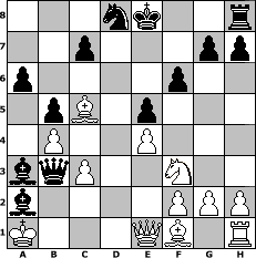 game notation in PGN-format [Event "Wrixum - Open die I."] [Site "www.myChess.de"] [Date "2004.12.11"] [Round "1"] [White "Knight"] [Black "OwainGwynedd"] [ECO "A41"] [WhitemyELO "1103"] [BlackmyELO "1277"] [Result "0-1"] [TimeControl "10/2592000"] [WhiteDays "30"] [BlackDays "30"] [MyChessNo "8719"] 1. d4 d6 2. e4 a6 3. Nc3 b5 4. Nf3 e6 5. Bg5 Be7 6. Qd2 e5 7. dxe5 dxe5 8. Nd5 f6 9. Be3 Bd6 10. O-O-O Ne7 11. Nb4 Be6 12. Kb1 Nbc6 13. Nxc6 Nxc6 14. b3 Qe7 15. c3 Ba3 16. b4 Qf7 17. Bc5 Rd8 18. Qe1 Bxa2+ 19. Ka1 Qb3 20. Rxd8+ Nxd8 0-1 position notation in FEN-format 3nk2r/2p3pp/p4p2/1pB1p3/1P2P3/bqP2N2/b4PPP/K3QB1R - k - 0 21 Captured white pieces: Captured black pieces: Click on a captured piece in order to display the desired move!