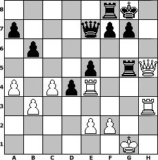 game notation in PGN-format [Event "Die Weinprobe 2017"] [Site "www.myChess.de"] [Date "2017.08.16"] [Round "1"] [White "Knight"] [Black "Joschi"] [ECO "B17"] [WhitemyELO "1206"] [BlackmyELO "1628"] [Result "0-1"] [TimeControl "10/1728000"] [WhiteDays "79"] [BlackDays "80"] [MyChessNo "109284"] 1. e4 c6 2. d4 d5 3. Nc3 dxe4 4. Nxe4 Nd7 5. Nf3 Ngf6 6. Nc3 e6 7. Bg5 Be7 8. Bd3 h6 9. Bh4 O-O 10. O-O Nb6 11. Re1 Qc7 12. a4 Nbd5 13. Nxd5 Nxd5 14. Bxe7 Qxe7 15. c3 b6 16. Ne5 Bb7 17. c4 Nf4 18. Nf3 Nxd3 19. Qxd3 Rfd8 20. h3 Qc7 21. Ne5 c5 22. Nf3 Bxf3 23. Qxf3 cxd4 24. b3 e5 25. Rad1 Re8 26. Re4 Qd6 27. g4 Rad8 28. Rd3 Re6 29. h4 Rf8 30. g5 hxg5 31. hxg5 Qe7 32. Qh5 Rg6 33. Rh3 Rxg5+ 0-1 position notation in FEN-format 5rk1/p3qpp1/1p6/4p1rQ/P1PpR3/1P5R/4PP2/6K1 - - - 0 34 Captured white pieces: Captured black pieces: Click on a captured piece in order to display the desired move!