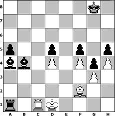 | game notation in PGN-format [Event "unter uns Nr. 47"] [Site "www.myChess.de"] [Date "2020.08.24"] [Round "1"] [White "borsti"] [Black "beowulf"] [ECO "D01"] [WhitemyELO "1188"] [BlackmyELO "1404"] [Result "0-1"] [TimeControl "10/864000"] [WhiteDays "50"] [BlackDays "50"] [MyChessNo "119193"] 1. d4 d5 2. Nc3 Nf6 3. Bg5 c6 4. h3 Bf5 5. e3 Nbd7 6. Nf3 h6 7. Bh4 g5 8. Bg3 Bg7 9. Bd3 Ne4 10. Nxe4 dxe4 11. Bxe4 Bxe4 12. O-O O-O 13. Nd2 Bg6 14. Nf3 Nb6 15. c3 e6 16. Qb3 Qd5 17. Qxd5 exd5 18. Ne5 Bf5 19. a4 Nd7 20. Nxd7 Bxd7 21. b3 f5 22. f4 g4 23. h4 Rfe8 24. Rfe1 Re4 25. Kf2 h5 26. Re2 Rc8 27. Rae1 c5 28. Rb2 cxd4 29. exd4 Rxe1 30. Kxe1 Rxc3 31. Bf2 Bf8 32. Kd2 Bb4 33. Ke2 b5 34. g3 bxa4 35. bxa4 a5 36. Ra2 Ra3 37. Rc2 Rxa4 38. Rc7 Bb5+ 39. Kd1 Ra1+ 40. Rc1 Ba4+ 0-1 position notation in FEN-format 6k1/8/8/p2p1p1p/bb1P1PpP/6P1/5B2/r1RK4 - - - 6 41 Captured white pieces:                              Captured black pieces:                               Click on a captured piece in order to display the desired move!