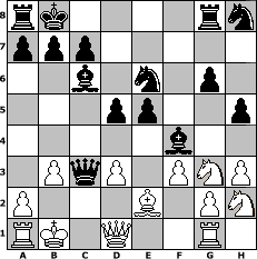 game notation in PGN-format [Event "Chess960 Open I 2014"] [Site "www.myChess.de"] [Date "2014.01.07"] [Round "1"] [White "faustballer"] [Black "SibylleSchwerdt"] [Variant "Fischerrandom"] [SetUp "1"] [FEN "rkqbbnrn/pppppppp/8/8/8/8/PPPPPPPP/RKQBBNRN w KQkq - 0 1"] [WhitemyELO "1525"] [BlackmyELO "1518"] [Result "0-1"] [TimeControl "10/3456000"] [WhiteDays "40"] [BlackDays "40"] [MyChessNo "92200"] 1. e4 d6 2. h3 e5 3. b3 f5 4. exf5 Qxf5 5. Bg4 Qf7 6. Ne3 Bc6 7. Ng3 g6 8. Be2 h5 9. f3 d5 10. d3 Bg5 11. Bd2 Ne6 12. Nef1 Bf6 13. Bc3 Qe7 14. Qd2 Bg5 15. Qd1 Qc5 16. Nh2 Qxc3 17. Ngf1 Qd4 18. Ng3 Bf4 19. c3 Qxc3 0-1 position notation in FEN-format rk4rn/ppp5/2b1n1p1/3pp2p/5b2/1PqP1PNP/P3B1PN/RK1Q2R1 - KQkq - 0 20 Captured white pieces: Captured black pieces: Click on a captured piece in order to display the desired move!