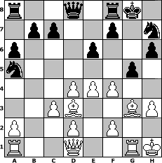 game notation in PGN-format [Event "Winterende2014"] [Site "www.myChess.de"] [Date "2014.03.06"] [Round "2"] [White "lasker"] [Black "borsti"] [ECO "D24"] [WhitemyELO "1155"] [BlackmyELO "1202"] [Result "0-1"] [TimeControl "10/1728000"] [WhiteDays "00"] [BlackDays "40"] [MyChessNo "93438"] 1. d4 d5 2. c4 dxc4 3. Nf3 Nf6 4. Nc3 h6 5. e3 Be6 6. e4 Bg4 7. Bxc4 e6 8. O-O Bb4 9. h3 Bxf3 10. gxf3 Nc6 11. Be3 Bxc3 12. bxc3 O-O 13. Bf4 a6 14. Bg3 Na5 15. Bd3 Nd7 16. Kh1 Nf6 17. Rg1 g5 18. f4 Nh7 0-1 position notation in FEN-format r2q1rk1/1pp2p1n/p3p2p/n5p1/3PPP2/2PB2BP/P2P1P2/R2Q2RK - - - 1 19 Captured white pieces: Captured black pieces: Click on a captured piece in order to display the desired move!