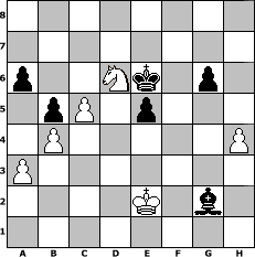 | game notation in PGN-format [Event "Schach f"] [Site "www.myChess.de"] [Date "2008.11.01"] [Round "2"] [Board "1"] [White "Holzhacker"] [Black "richym3"] [ECO "B65"] [WhitemyELO "2087"] [BlackmyELO "1805"] [Result "1/2-1/2"] [TimeControl "10/2592000"] [WhiteDays "27"] [BlackDays "26"] [MyChessNo "49361"] 1. e4 c5 2. Nf3 d6 3. d4 cxd4 4. Nxd4 Nf6 5. Nc3 Nc6 6. Bg5 e6 7. Qd2 Be7 8. O-O-O O-O 9. f4 Nxd4 10. Qxd4 Qa5 11. e5 dxe5 12. Qxe5 Qxe5 13. fxe5 Nd5 14. Bxe7 Nxe7 15. Bd3 b6 16. Rhe1 Bb7 17. Bxh7+ Kxh7 18. Rd7 Bxg2 19. Rxe7 a6 20. Re2 Bh1 21. Ne4 Rae8 22. Rxe8 Rxe8 23. Nd6 Rf8 24. c4 Kg6 25. Re1 Bc6 26. b4 f5 27. exf6 Kxf6 28. Rf1+ Ke7 29. Rxf8 Kxf8 30. Nc8 b5 31. c5 Bd5 32. a3 e5 33. Kd2 Kf7 34. Ke3 Ke6 35. Nd6 g6 36. Ke2 Bg2 37. Kf2 Bc6 38. Kg3 Bd5 39. Kg4 Kf6 40. h4 Bc6 41. Kg3 Ke6 42. Kf2 Ba8 43. Ke2 Bg2 1/2-1/2 position notation in FEN-format 8/8/p2Nk1p1/1pP1p3/1P5P/P7/4K1b1/8 - - - 7 44 Captured white pieces:                              Captured black pieces:                               Click on a captured piece in order to display the desired move!