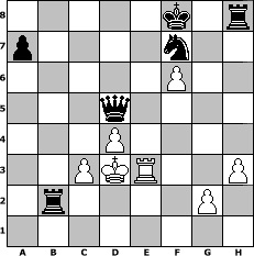 game notation in PGN-format [Event "f"] [Site "www.myChess.de"] [Date "2005.12.25"] [Round "1"] [White "PublicEnemy"] [Black "MichaelKnopf"] [ECO "D01"] [WhitemyELO "1469"] [BlackmyELO "1499"] [Result "0-1"] [TimeControl "10/864000"] [WhiteDays "10"] [BlackDays "10"] [MyChessNo "21154"] 1. d4 d5 2. Nc3 e6 3. a3 g6 4. Bf4 Bg7 5. Nf3 h6 6. Nb5 Na6 7. e3 h5 8. Bd3 Ne7 9. Bg5 f6 10. Nh4 fxg5 11. Nxg6 Nxg6 12. Bxg6+ Kf8 13. Bxh5 c5 14. Qf3+ Bf6 15. O-O-O Ke7 16. Bg4 Bd7 17. Qe2 c4 18. Nc3 b5 19. e4 dxe4 20. Qxe4 Nc7 21. h3 Kf8 22. Rhf1 b4 23. axb4 Rb8 24. f4 Rxb4 25. fxg5 Ne8 26. gxf6 Rb8 27. Bxe6 Bxe6 28. Qxe6 Nd6 29. Nd5 Nf7 30. c3 Qa5 31. b4 cxb3 32. Rf3 b2+ 33. Kb1 Qa1+ 34. Kc2 b1=Q+ 35. Rxb1 Qxb1+ 36. Kd2 Rb2+ 37. Ke3 Qe1+ 38. Kd3 Qxe6 39. Re3 Qxd5 0-1 position notation in FEN-format 5k1r/p4n2/5P2/3q4/3P4/2PKR2P/1r4P1/8 - - - 0 40 Captured white pieces: Captured black pieces: Click on a captured piece in order to display the desired move!