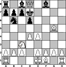 game notation in PGN-format [Event "f"] [Site "www.myChess.de"] [Date "2005.12.25"] [Round "1"] [White "Vouivre"] [Black "stierdame1965"] [ECO "C40"] [WhitemyELO "1428"] [BlackmyELO "925"] [Result "1-0"] [TimeControl "10/864000"] [WhiteDays "10"] [BlackDays "10"] [MyChessNo "21134"] 1. e4 e5 2. Nf3 f6 3. Nxe5 d6 4. Qh5+ g6 5. Nxg6 hxg6 6. Qxh8 Ne7 7. Qxf6 Ng8 8. Qxg6+ Ke7 9. d4 Nf6 10. Bg5 Nbd7 11. Nc3 Nb6 12. Qxf6+ Kd7 13. Qxd8+ 1-0 position notation in FEN-format r1bQ1b2/pppk4/1n1p4/6B1/3PP3/2N5/PPP1PPPP/R3KB1R - KQ - 0 13 Captured white pieces: Captured black pieces: Click on a captured piece in order to display the desired move!