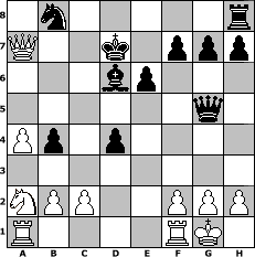 game notation in PGN-format [Event "1. Fr"] [Site "www.myChess.de"] [Date "2009.02.01"] [Round "1"] [White "Jolilein"] [Black "Tomino"] [ECO "A11"] [WhitemyELO "1745"] [BlackmyELO "1649"] [Result "1-0"] [TimeControl "10/864000"] [WhiteDays "16"] [BlackDays "08"] [MyChessNo "52221"] 1. c4 c6 2. Nc3 d5 3. d4 dxc4 4. e4 b5 5. a4 b4 6. Na2 e6 7. Bxc4 Nf6 8. Qd3 c5 9. Nf3 cxd4 10. e5 Nfd7 11. Bg5 Qc7 12. O-O Nxe5 13. Nxe5 Qxe5 14. Qf3 Qxg5 15. Qxa8 Bd6 16. Bb5+ Bd7 17. Bxd7+ Kxd7 18. Qxa7+ 1-0 position notation in FEN-format 1n5r/Q2k1ppp/3bp3/6q1/Pp1p4/8/NPP2PPP/R4RK1 - - - 0 18 Captured white pieces: Captured black pieces: Click on a captured piece in order to display the desired move!