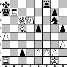 game notation in PGN-format [Event "Schachkreis #2"] [Site "www.myChess.de"] [Date "2018.07.05"] [Round "1"] [White "JohnWayne"] [Black "alibengali"] [ECO "C68"] [WhitemyELO "1705"] [BlackmyELO "1686"] [Result "1-0"] [TimeControl "10/2592000"] [WhiteDays "30"] [BlackDays "30"] [MyChessNo "112519"] 1. e4 e5 2. Nf3 Nc6 3. Bb5 a6 4. Bxc6 dxc6 5. O-O Bg4 6. h3 h5 7. d3 Qf6 8. Nbd2 Ne7 9. Re1 Bxf3 10. Nxf3 Ng6 11. Bg5 Qd6 12. a4 f6 13. Be3 O-O-O 14. Qb1 Be7 15. b4 Kb8 16. b5 c5 17. Qb3 a5 18. b6 Rhf8 19. bxc7+ Qxc7 20. Nd2 Bd6 21. Nc4 f5 22. Reb1 Rd7 23. Qb5 fxe4 24. Nxa5 exd3 25. Nxb7 dxc2 26. Nxd6+ Ka7 27. Bxc5+ Ka8 28. Qa6+ Qa7 29. Qc6+ Rb7 30. Rxb7 1-0 position notation in FEN-format k4r2/qR4p1/2QN2n1/2B1p2p/P7/7P/2p1PPP1/R5K1 - - - 0 30 Captured white pieces: Captured black pieces: Click on a captured piece in order to display the desired move!