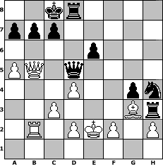 game notation in PGN-format [Event "9er5"] [Site "www.myChess.de"] [Date "2015.01.04"] [Round "1"] [White "Naunhofer"] [Black "spiderman"] [ECO "A50"] [WhitemyELO "1605"] [BlackmyELO "1721"] [Result "0-1"] [TimeControl "10/3456000"] [WhiteDays "40"] [BlackDays "40"] [MyChessNo "97409"] 1. d4 Nf6 2. c4 d5 3. Nc3 dxc4 4. e3 Be6 5. Nf3 Nc6 6. Be2 Qd7 7. O-O O-O-O 8. Qa4 Nd5 9. Bxc4 Nxc3 10. bxc3 Bxc4 11. Qxc4 e6 12. a4 f6 13. e4 g5 14. Be3 h5 15. a5 g4 16. Nh4 Ne7 17. Rfb1 Qc6 18. Qd3 Bh6 19. g3 Bg5 20. Ng2 h4 21. Nxh4 Bxh4 22. gxh4 Rxh4 23. Bf4 Rh3 24. Bg3 f5 25. exf5 Nxf5 26. Rb4 Nh4 27. Kf1 Qh1+ 28. Ke2 Qxa1 29. Qb5 Qa2+ 30. Rb2 Qd5 0-1 position notation in FEN-format 2kr4/ppp5/4p3/PQ1q4/3P2pn/2P3Br/1R1PKP1P/8 - - - 4 31 Captured white pieces: Captured black pieces: Click on a captured piece in order to display the desired move!